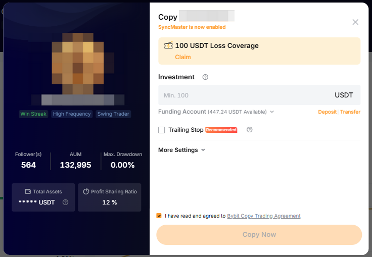 Investment | This is the total amount you will invest in copying this Master Trader. You may enter the amount according to your Bybit account balance and also choose which account balance to use, either a Unified Trading Account or Funding Account. Generally, the minimum funds to copy is 100 USDT. However, the Master Trader may suggest or force sync his followers on the minimum funds required to copy him. |