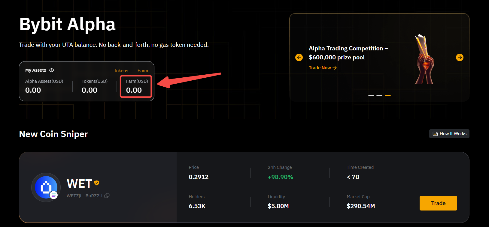 If you're using the Bybit App, simply go to Bybit Alpha homepage → Assets → Farm.