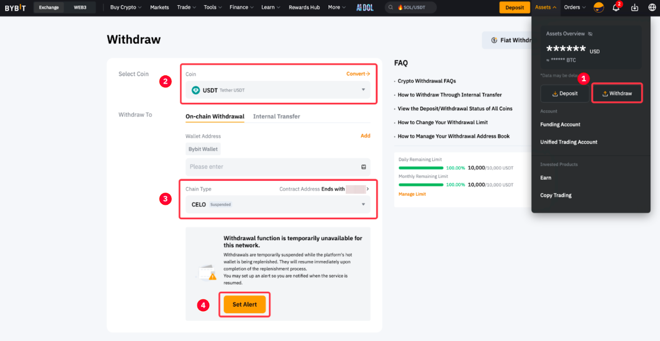 You can now set automatic alerts on the Withdrawal page by selecting the token and chain type of your choice and clicking on Set Alert.