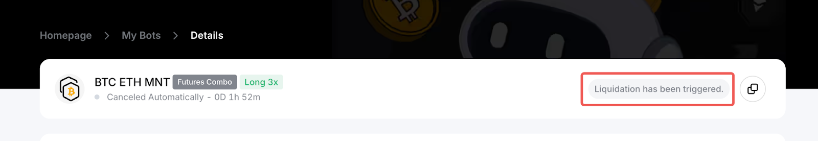 Please note that the system will automatically terminate the bot and you will see the liquidation status message on the upper right corner of the bot details.