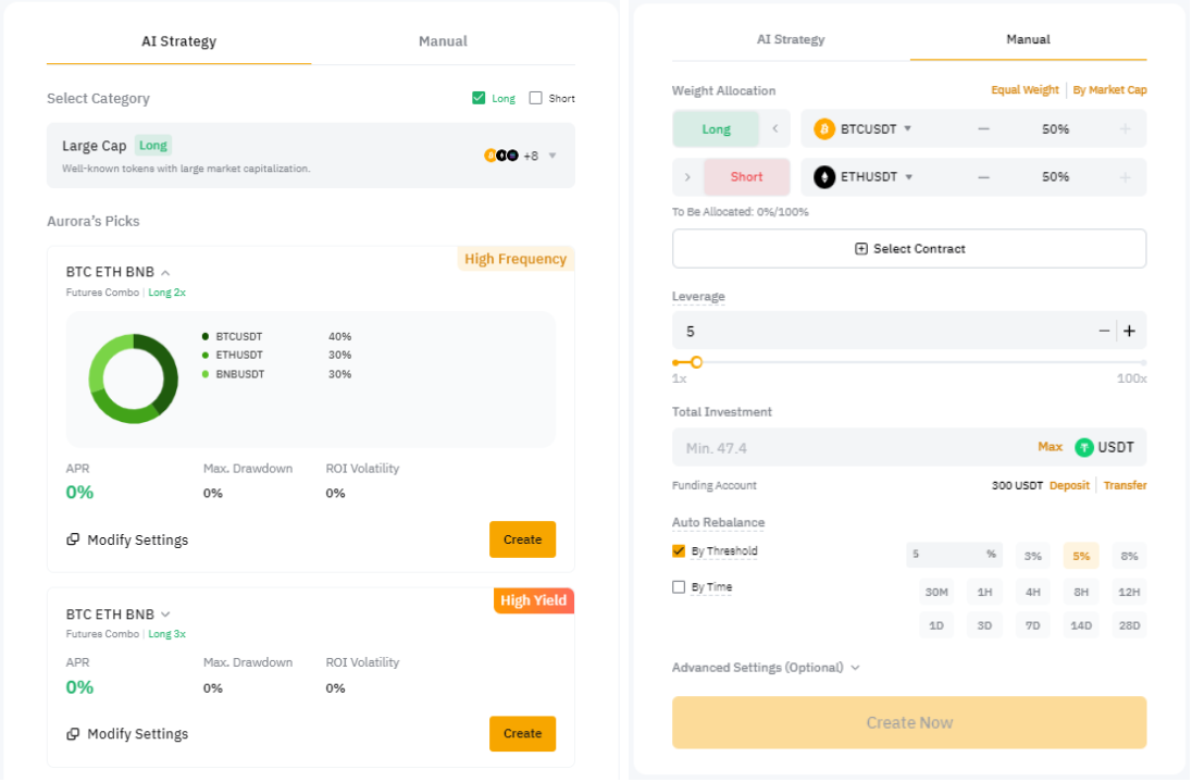 When one of the contracts triggers a rebalance condition, the system will automatically rebalance the portfolio. For instance, if BTCUSDT hits 40% or falls below 20%, the system will trigger a rebalancing, reverting the allocation to BTCUSDT at 30% and ETHUSDT at 70%.
