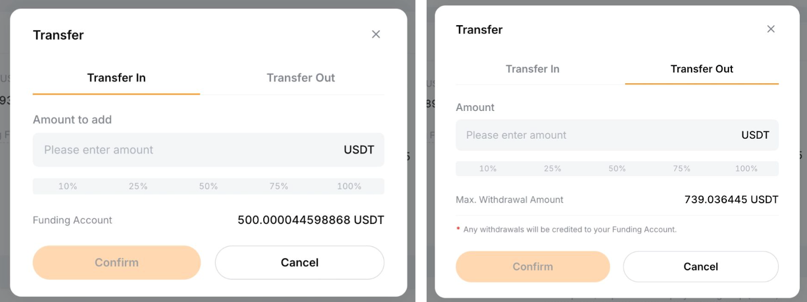 In the case of withdrawal, please note that the available withdrawable amount is directly proportional to your position’s P&L and may impact your position risk.