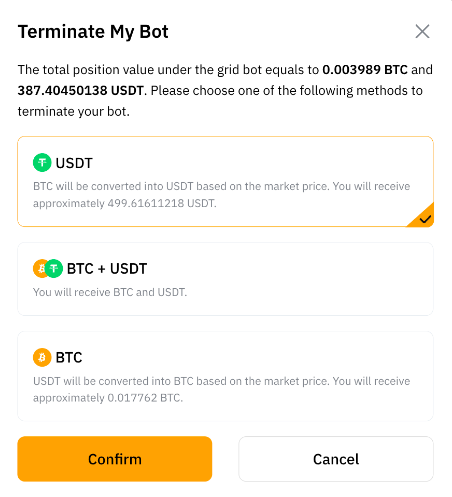 If you choose BTC+USDT, the amount of coins received will be the same as the total profit. If you choose USDT or BTC, the exchange between tokens will be based on the market price, and the corresponding Spot trading fee will be charged. This is why you may receive less than the total profit shown under Profit on the Details page.