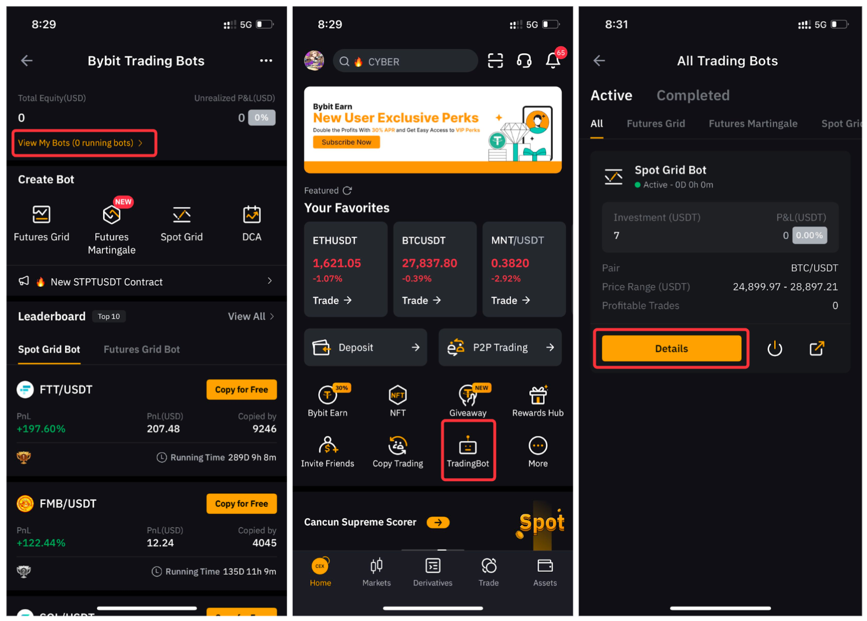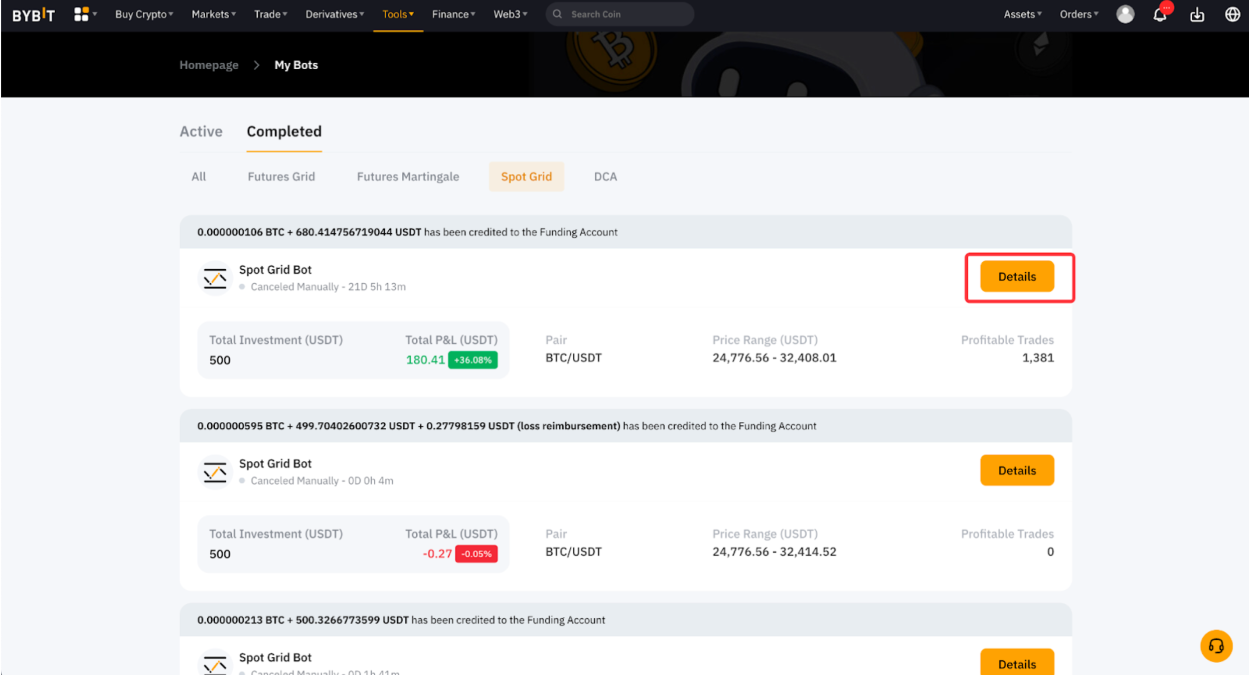 On the Bybit website, please head to My Bots to view all active and completed bots. Click on Details for the specific bot to access its detailed information.