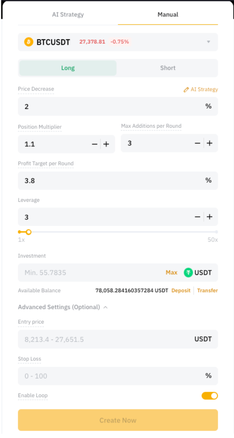 On the Futures Martingale Bot interface, you can choose between two modes when creating a bot: AI Strategy or Manual mode. In AI Strategy mode, the parameters are automatically adjusted to execute the optimal strategy determined by AI based on historical data.