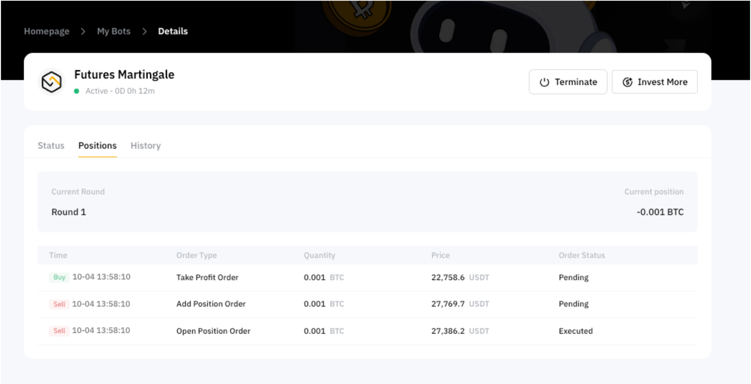 On the Bot Details Page, you'll find comprehensive information about the Futures Martingale bot, including the parameters you've configured. In addition to these settings, there are other crucial pieces of information that you should take note of: