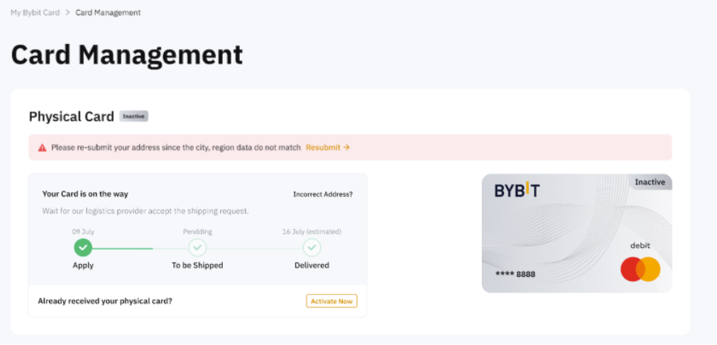 — Bybit reserves the right to reject any address change request if the edited address is inconsistent with your virtual Bybit Card's Address Verification. We currently do not support submitting additional proof of address to change the shipping address.