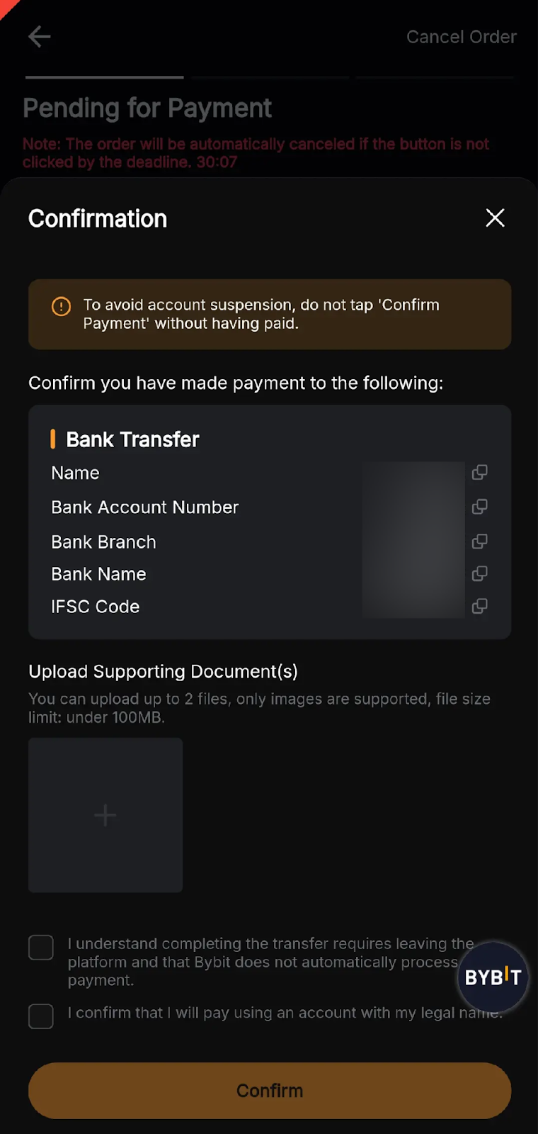 — Your bank account name must be consistent with your registered name on Bybit. Otherwise, your account might be suspended and you may encounter permanent asset loss as the seller has a right to refuse to release the coin to you.