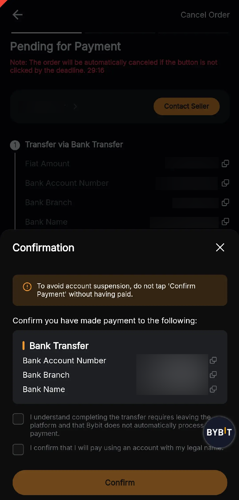 — Failing to transfer the funds to the Seller within the set timer in your Bybit account will automatically cancel your order.
