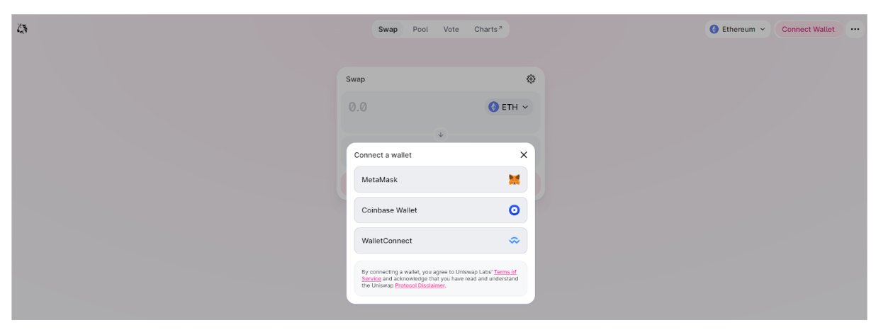 Step 2: Click on Connect Wallet in the upper right corner of the Uniswap page. If there is no Bybit Wallet to be connected, you can select MetaMask to link Bybit Wallet. Before proceeding, please make sure you have added the Bybit Wallet extension.