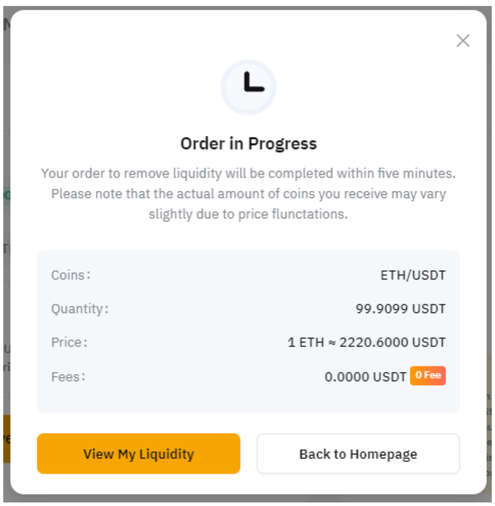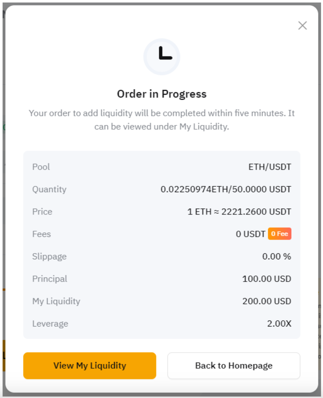 Please note that your order to add liquidity will be completed within five minutes. If the newly added liquidity is still pending, the liquidity of the corresponding trading pair cannot be removed.