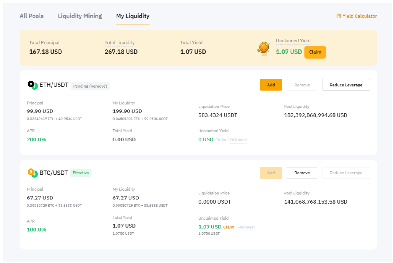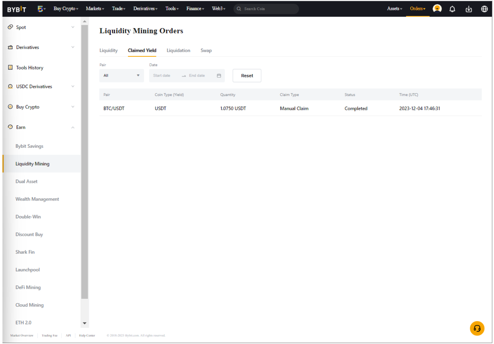To view details of claim yields, please head to Orders→ Earn Order → Liquidity Mining → Claimed Yield.