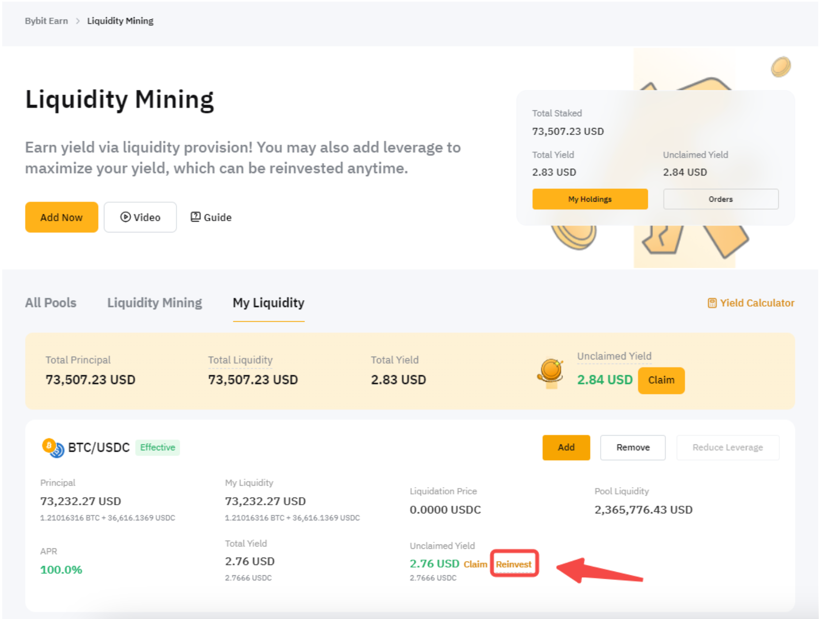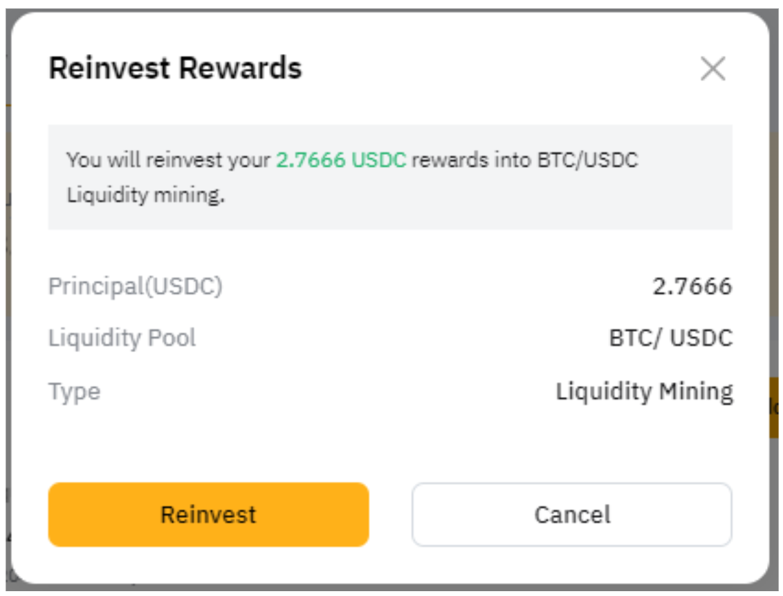 Step 2: Click on Reinvest in the reinvestment confirmation window to add your yield to the liquidity pool.