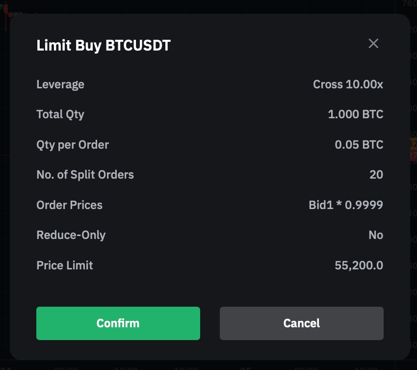 There are two (2) split settings and four (4) order placement options available for traders on Bybit.