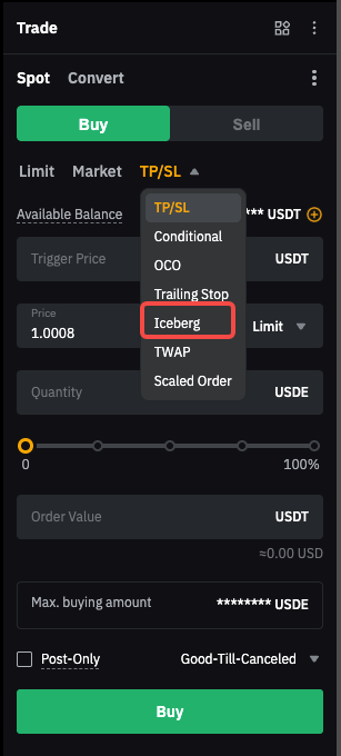 Step 1: Visit the trading page you wish to trade, then select Iceberg order.