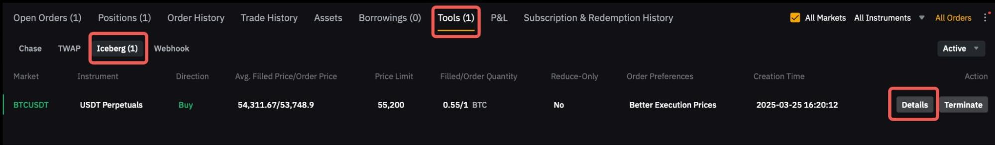 — Iceberg Orders are supported in both the Main Account and Subaccounts. Each account is limited to a maximum of 10 Iceberg Orders and each symbol can only open 1 Iceberg Order.
