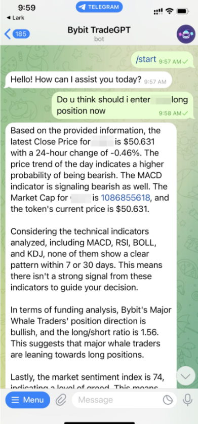 Easy Access and Expert Analysis: Connect directly with TradeGPT on Telegram for easy access to real-time data from Bybit, combined with cutting-edge data analytics for advanced analysis.