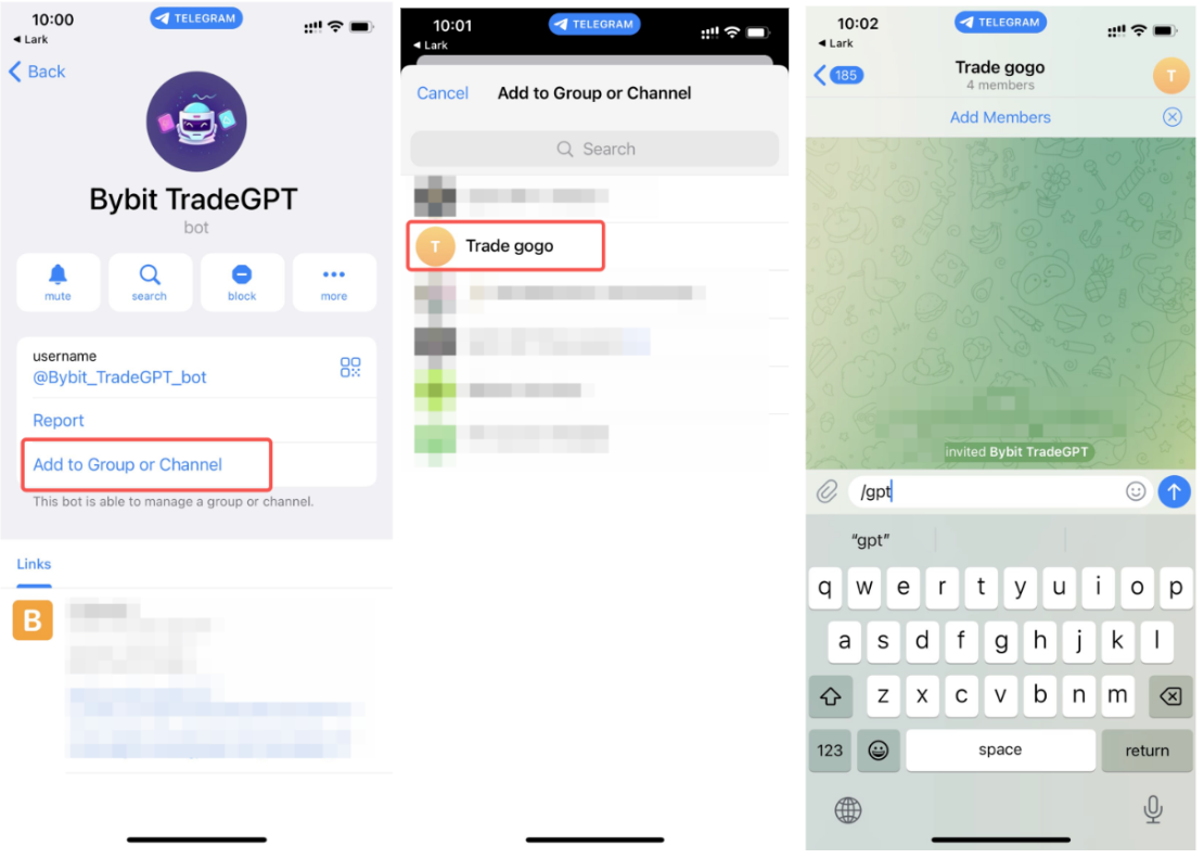 - Click on Add to Group or Channel on the Bybit TradeGPT Info page.