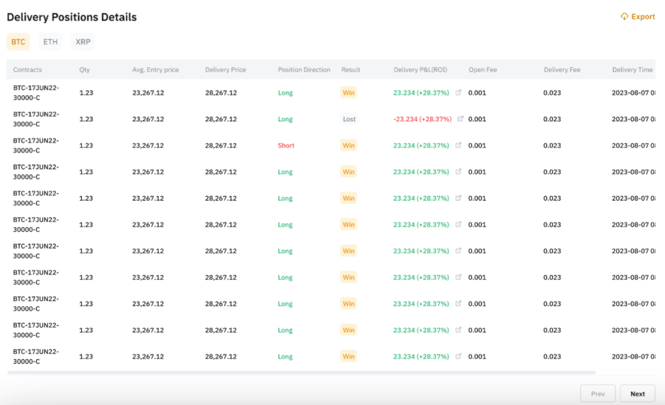 In the Details of Delivery Positions tab, you can select All to view all delivery positions. Alternatively, you can access comprehensive position details for specific contracts, including contract name, quantity, average entry price, delivery price, realized price, and more.