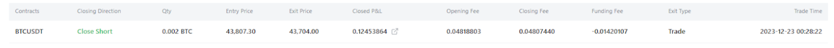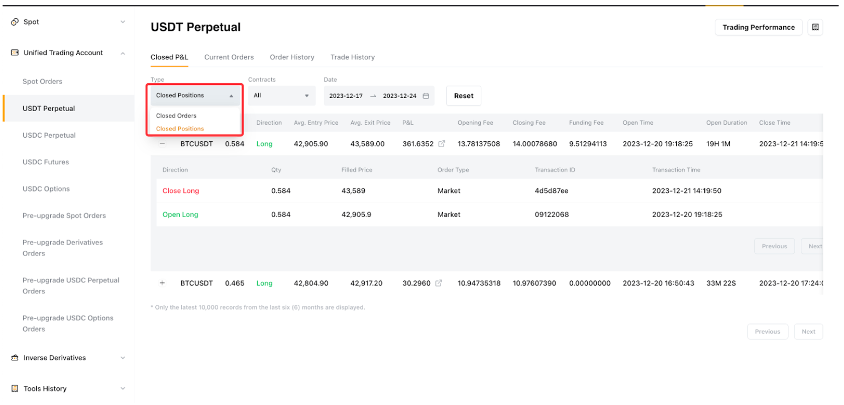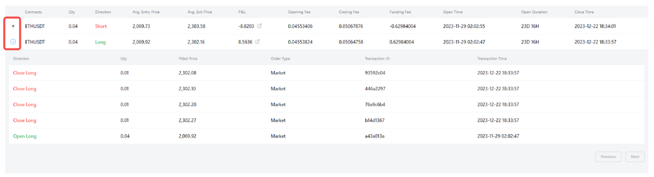 3) For Closed Position, you can review a comprehensive log of your closed Long and Short positions. It includes details from the initial opening order to the final closing order and shows the full P&L for that position calculated based on the Average Exit Price.